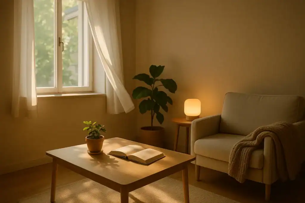 A simple calm-home routine with fresh air, warm light and tidy surfaces.
